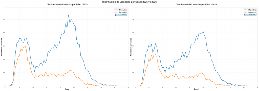 Observamos que hay un refresco continuo de licencias: personas que ya no se federan y otras que comienzan. Esto ocurre de forma general en todas las edades, si bien, hay casos concretos donde se aprecian variaciones. A continuación, mostramos una explicación plausible, según nuestro criterio