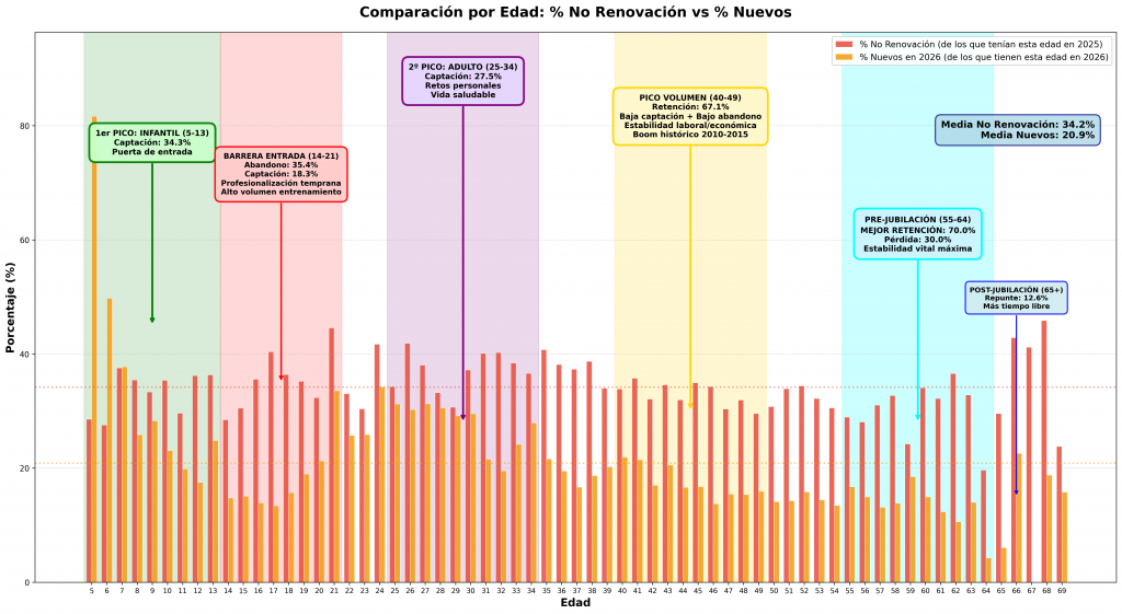 - Base de practicantes que envejece. Esto es una suposición basado en (1) observación de las licencias 2025 y 2026 y (2) El triatleta medio tiene 33 años. Si no se renueva la base joven, el deporte pierde licencias por desgaste natural sin que lleguen reemplazos. El titulo de este articulo y la profesionalización temprana tiene mucho con ver con esto.
