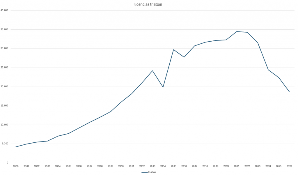 Siendo la evolución del triatlón la siguiente ( datos hasta 2024 ofrecidos por CSD y 2025 y 2026 extraídos de la Fetri)