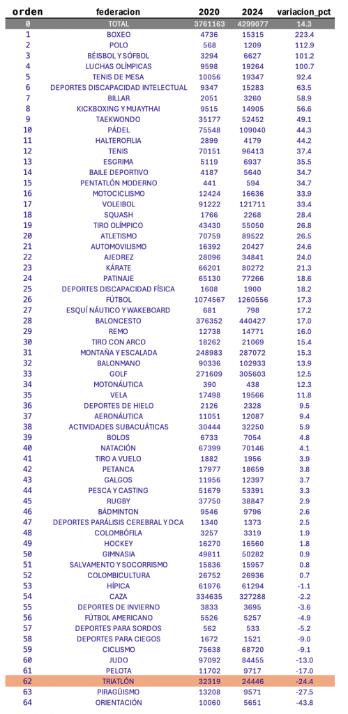 Utilizando las licencias deportivas federativas publicadas por el CSD: https://www.csd.gob.es/es/federaciones-y-asociaciones/federaciones-deportivas-espanolas/licencias . De 65 deportes, se observa que la tendencia general (2020 vs 2024) es un 14,3% creciente, pero hay 11 con tendencia decreciente, siendo el Triatlón el top3