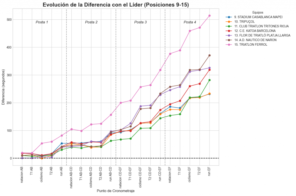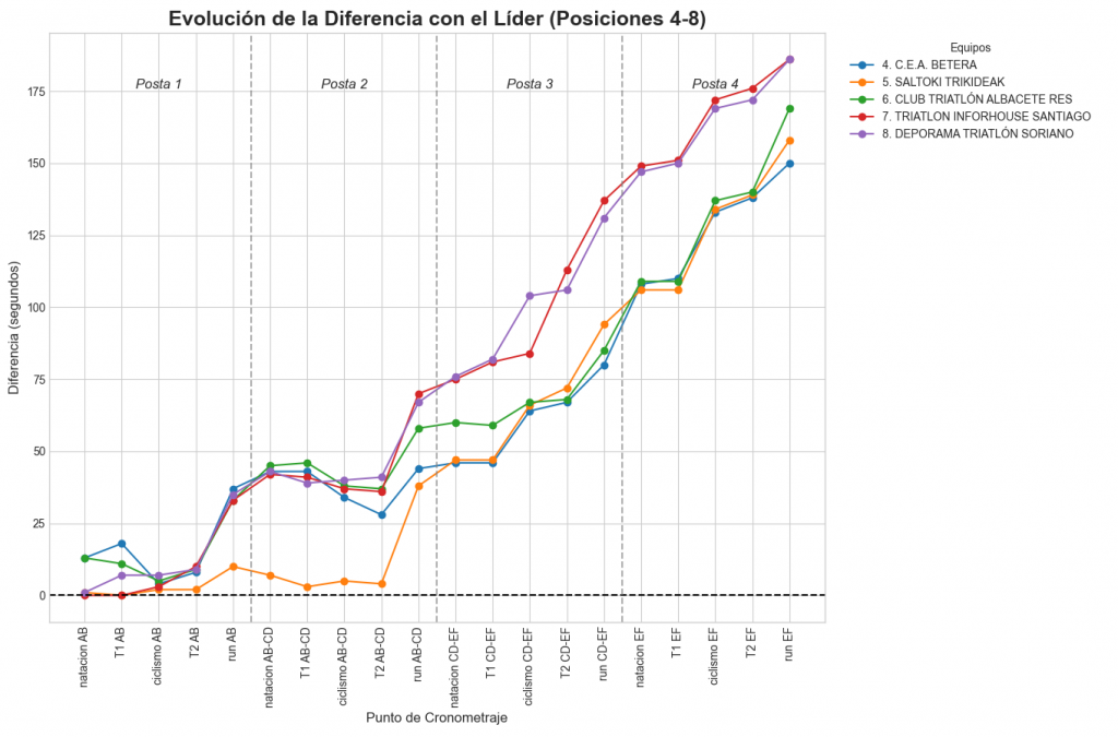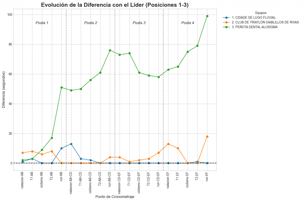 Se muestra la variación en tiempo respecto a la cabeza de carrera en los 20 puntos de cronometraje.